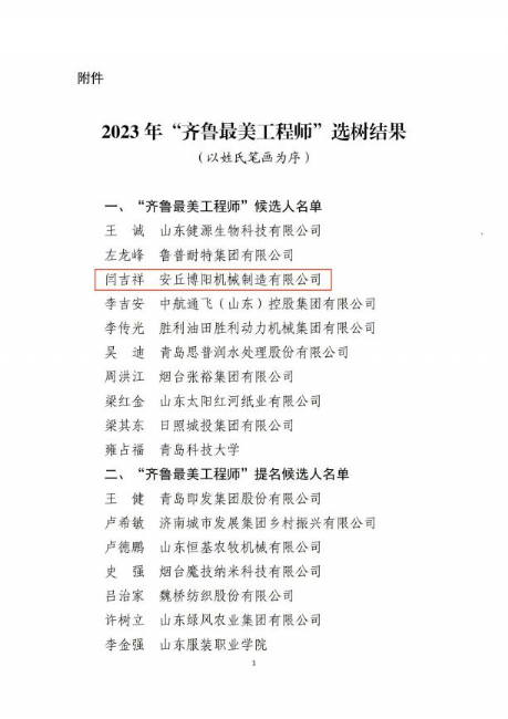 根據(jù)山東省工程師協(xié)會(huì)2023年“齊魯zui美工程師”選樹活動(dòng)評(píng)選辦法和相關(guān)工作安排,經(jīng)選拔推薦、資格審查、專家初評(píng)、實(shí)地考察、專家高評(píng)等程序,安丘博陽機(jī)械制造有限公司總經(jīng)理閆吉祥評(píng)選為“齊魯zui美工程師”。