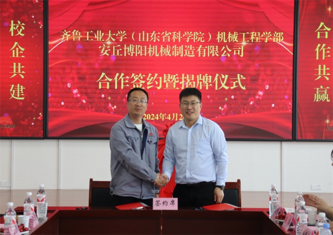 4月26日,安丘博陽(yáng)機(jī)械制造有限公司與齊魯工業(yè)大學(xué)(山東省科學(xué)院)共同舉辦機(jī)械類專業(yè)協(xié)同育人基地授牌儀式。此次授牌儀式標(biāo)志著雙方在機(jī)械類專業(yè)領(lǐng)域的深度合作達(dá)到新的高度,為培養(yǎng)高素質(zhì)機(jī)械類專業(yè)人才奠定了堅(jiān)實(shí)的基礎(chǔ)。齊魯工業(yè)大學(xué)機(jī)械工程學(xué)部黨委副書記宋開宇一行,安丘市工業(yè)和信息化局黨組成員、副局長(zhǎng)王振,安丘市工業(yè)和信息化局黨組成員、一級(jí)主任科員宋曉東,石堆鎮(zhèn)黨委副書記劉建珍,安丘博陽(yáng)機(jī)械制造有限公司總經(jīng)理閆吉祥,副總經(jīng)理李文明出席活動(dòng)。